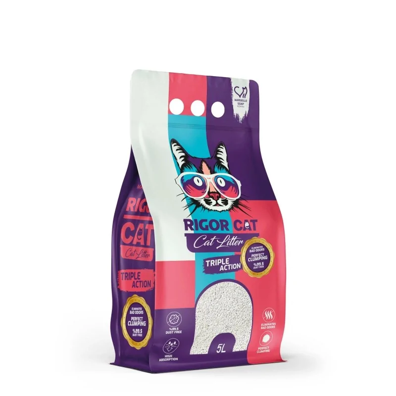 La litière agglomérante Rigor parfumé au Savon de Marseille, est conçue pour offrir une propreté, une praticité et un contrôle des odeurs supérieurs aux foyers possédant un ou plusieurs chats.